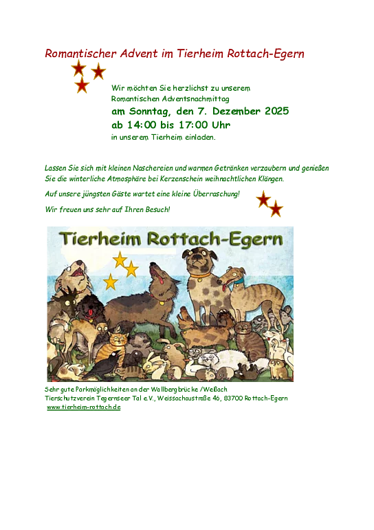 Wir möchten Sie herzlichst zu unserem Romantischen Adventsnachmittag am Sonntag, den 7. Dezember 2025 ab 14:00 bis 17:00 Uhr in unserem Tierheim einladen.
