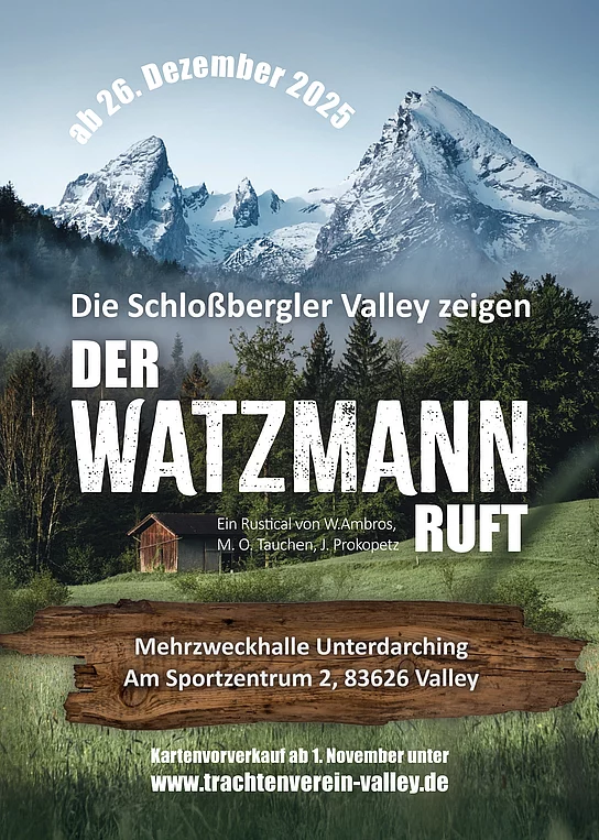 Die Theatergruppe der Schloßbergler Valley bringt heuer ein besonderes Stück auf die Bühne: die Alpensaga „Der Watzmann ruft!“ von Wolfgang Ambros und Manfred Tauchen. Dort vereinen sich Theater, Musik, Gesang und Tanz zu einem Rustical mit Kultstatus. Die Premiere findet am 26. Dezember in der Mehrzweckhalle Unterdarching statt.