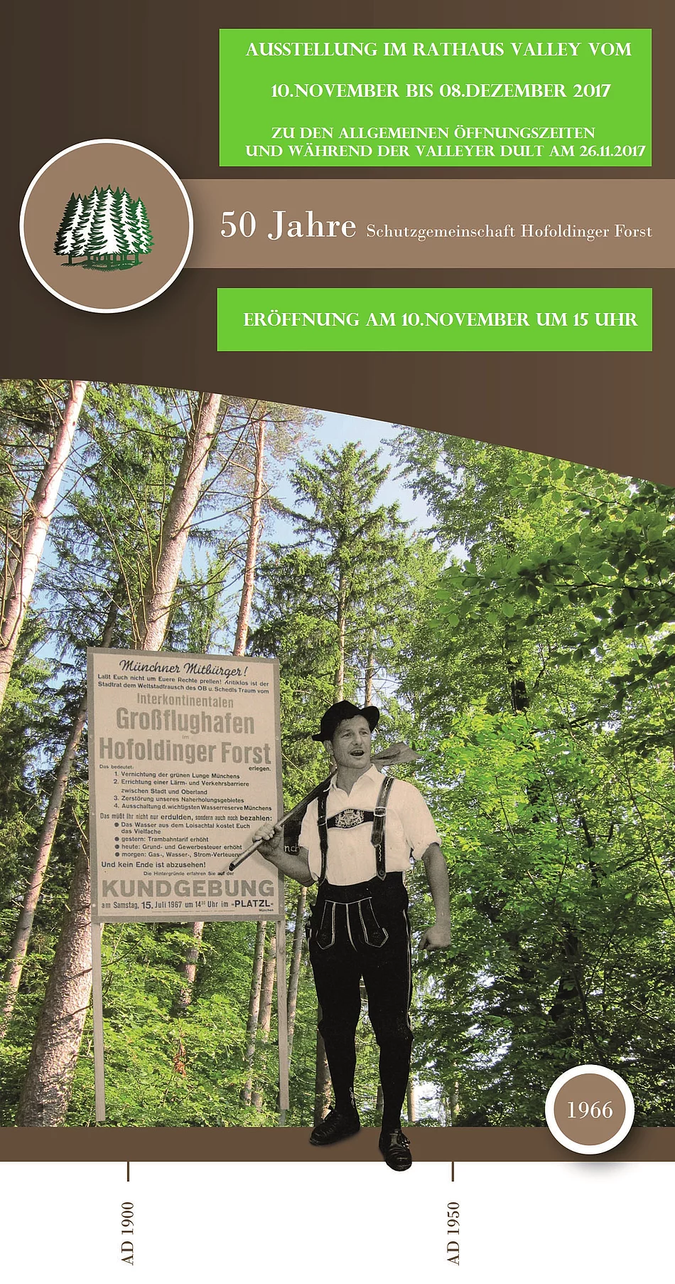 Die Schutzgemeinschaft Hofoldinger Forst feiert 50 jähriges Jubiläum. Anlässlich dieses Jubiläums konzipierte das Archiv der Gemeinde Aying eine Ausstellung zum Thema. Die Gemeinde Valley freut sich, die Ausstellung „50 Jahre Schutzgemeinschaft Hofoldinger Forst“ in der Zeit vom 10. November – 08. Dezember 2017 allen interessierten Bürgerinnen und Bürgern im Sitzungssaal des Rathauses Valley präsentieren zu können.