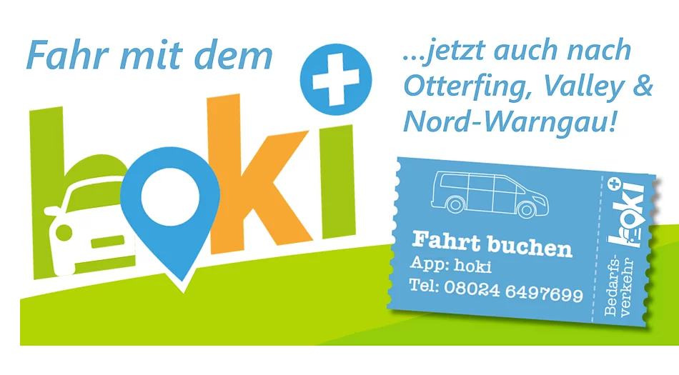 Es ist soweit - Fahrgäste können den beliebten Holzkirchner Bedarfsverkehr "hoki" jetzt auch in unserer Gemeinde und in den Nachbargemeinden Otterfing und Nord-Warngau nutzen. Das erweiterte Angebot fährt unter dem Namen "hoki+".