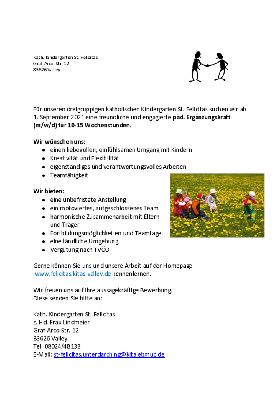 Für unseren dreigruppigen katholischen Kindergarten St. Felicitas suchen wir ab 1. September 2021 eine freundliche und engagierte päd. Ergänzungskraft (m/w/d) für 10-15 Wochenstunden.