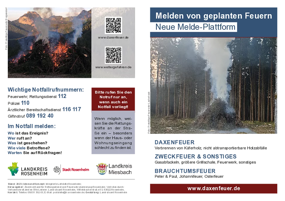 Was ist Daxenfeuer.de? Unter www.daxenfeuer.de können Sie Daxenfeuer, Brauchtumsfeuer oder auch sonstige Zweckfeuer kostenfrei, schnell und einfach online bei der Integrierten Leitstelle Rosenheim melden.