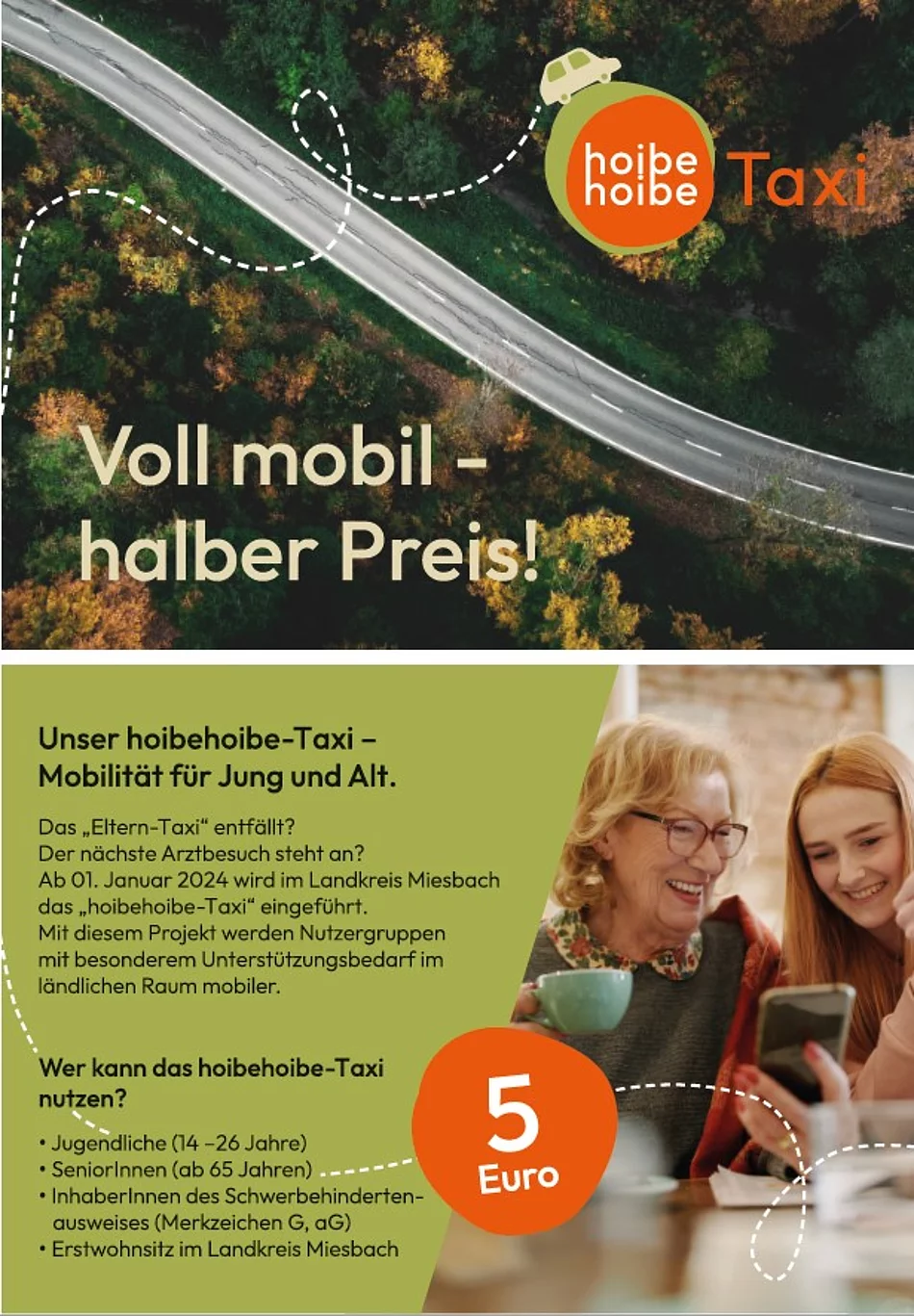 Das „Eltern-Taxi“ entfällt? Der nächste Arztbesuch steht an? Ab 01. Januar 2024 wird im Landkreis Miesbach das „hoibehoibe-Taxi“ eingeführt. Mit diesem Projekt werden Nutzergruppen mit besonderem Unterstützungsbedarf im ländlichen Raum mobiler. Zudem wird die Sicherheit auf den Straßen unterstützt, indem das Unfallrisiko von Selbstfahrern durch Alkohol-, Drogen- und Medikamenteneinfluss gesenkt wird.