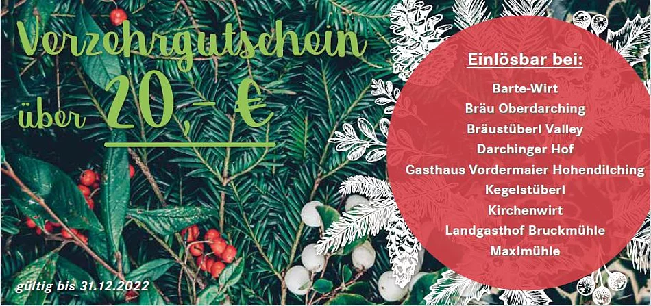 Auch dieses Jahr musste unser traditonelles Weihnachtsessen der Gemeinde mit allen Mitarbeiter und Menschen, die sich für die Gemeinde das ganze Jahr über engagieren, abgesagt werden. Als kleines Dankeschön bekommen alle die eingeladen gewesen wären, wieder einen Verzehrgutschein. Dieser kann bei unseren Wirtschaften und Gaststätten eingelöst werden. Wer noch ein Weihnachtsgeschenk sucht, kann auch dieses Jahr den Gutschein bei der Gemeindeverwaltung käuflich erwerben. Schöne Weihnachten und ein gesundes neues Jahr. Bleibts gsund.